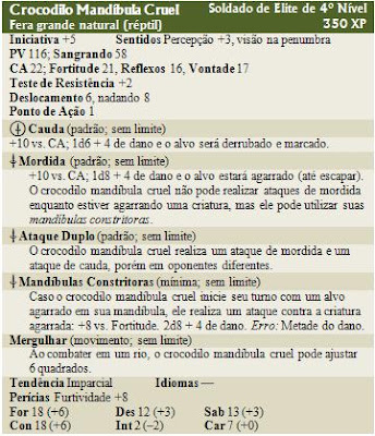 Quando se aproximou do elfo patrulheiro o crocodilo finalmente conseguiu abocanhá-lo, o elfo inicialmente tentou se libertar mas seus esforços não foram bons o bastante então ele sacou suas duas lâminas e começou a atacar o crocodilo, os demais do grupo já aviam acabado seus poderes diários e por encontro, apenas sobrando seus poderes sem limites. O crocodilo com o elfo em sua boca desferiu um ataque violentíssimo contra o elfo que o fez desmaiar com 0 pontos de vida. Tendo sua refeição garantida o crocodilo tratou de se retirar de volta para a “piscina”.